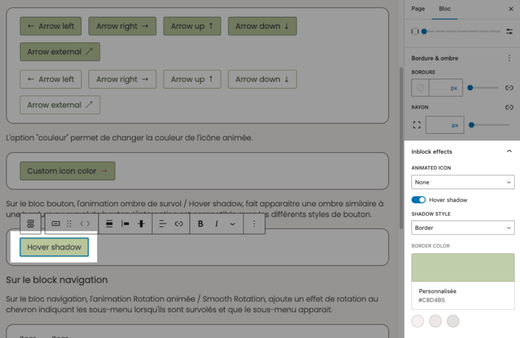 Sur le bloc bouton, l’animation ombre de survol / Hover shadow, fait apparaitre une ombre similaire à une bordure au survol du bouton. L’interaction est compatible avec les différents styles de bouton. Les options vous permettent de choisir la couleur et l’épaisseur de l’ombre ajoutée et de choisir entre deux options visuelles : border et rise.