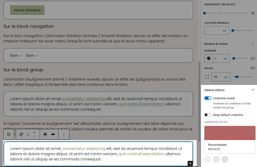 L’animation Soulignement animé / Underline reveals, ajoute un effet de surlignement au survol des liens. L’effet s’applique à l’ensemble des liens contenus dans le bloc.
